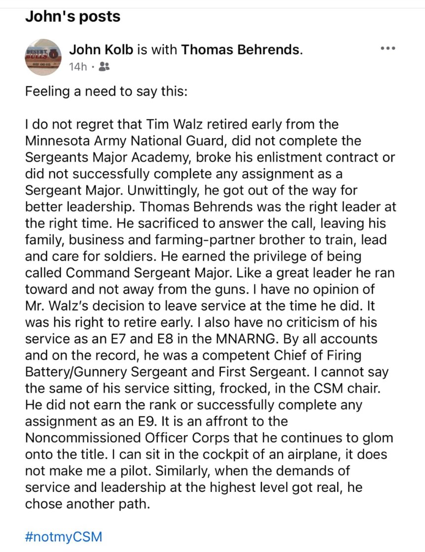 Auf einer Farm in Brewster, Minnesota lebt Tom Behrends. Ein ehemaliger Kamerad von Walz aus der Nationalgarde und sein Nachfolger als CSM der Einheit. Als Walz als Kandidat für die Gouverneurswahl auftrat, hat Behrends deutlich Flagge gezeigt: