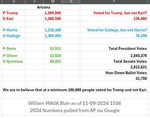 Auffällig ist hier die Diskrepanz der Wähler bei der Abstimmung für Präsident und Senat. Kari Lake hat 139.460 Stimmen WENIGER als Trump bekommen, aber Gallego (der Kartell-Heini) 76.296 Stimmen MEHR als die Präsidentschaftskandidatin der Demokraten. In Wisconsin sieht die Lage in etwa ähnlich aus.