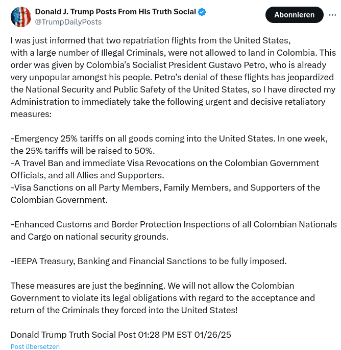 Im Prinzip bleibt Petro nichts anderes übrig, als sofort einzuknicken. Aber Stolz und Eitelkeiten werden das nicht zulassen. Um so schneller sind hier die Uribisten wieder an der Macht und mit denen kann Trump dann sicherlich bessere Deals machen. Manchmal ist das echt toll, dass er Müll sich selbst rausträgt.