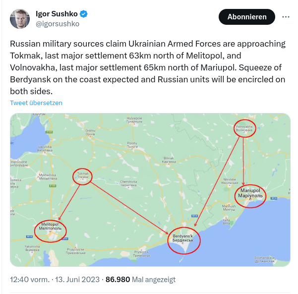 Wie schon vor ein paar Tagen gesagt: Man muss schauen, ob das, was die Ukraine an Material hat nun ausreicht, einen Durchstoß bis an das Asowsche Meer zu schaffen. Viel wird dabei von der Moral und der verbliebenen Kampfkraft der Russen abhängen. Falls die Ukrainer irgendwo durchstoßen, kann sich die Sache relativ fix drehen.