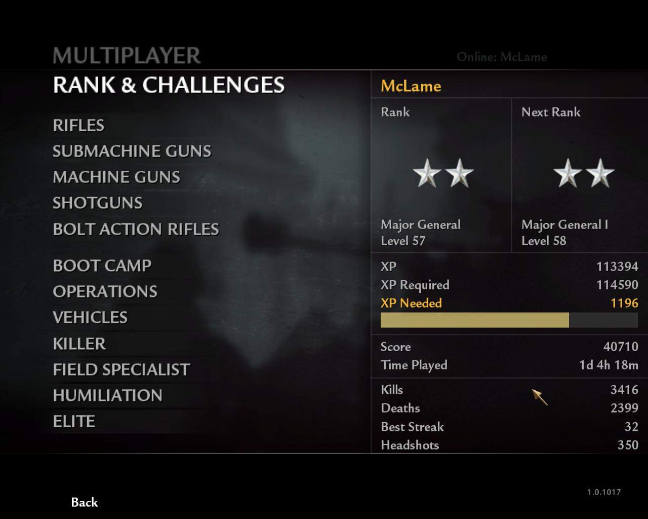 Ok ab 50 lief es schon etwas schleppender aber geht imho gut vorran, aktuell über 1 Tag Spielzeit, ja meine Gesamt-KD ist nicht so beraubend (verhunztes Spawnsystem elendes dreckiges) sowas passiert wenn man Karabiner hochlvln will. :roll: