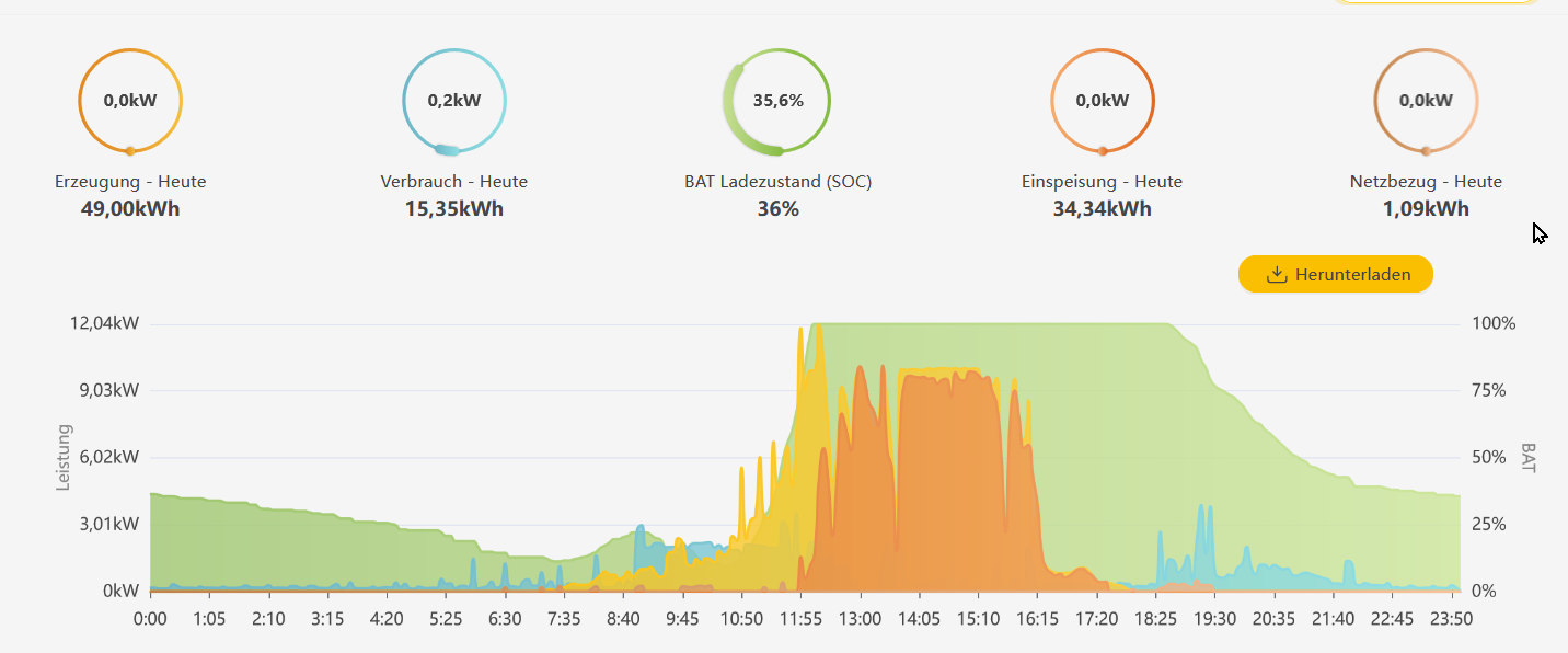 Hat gestern leider von 7:30 - bis fast 18:00 gedauert, in dem Moment wo die Wärmepumpe loslegen musse hat es leider ein Unwetter gegeben, und der voll geladene Akku musste den Strom zum aufheizen liefern: