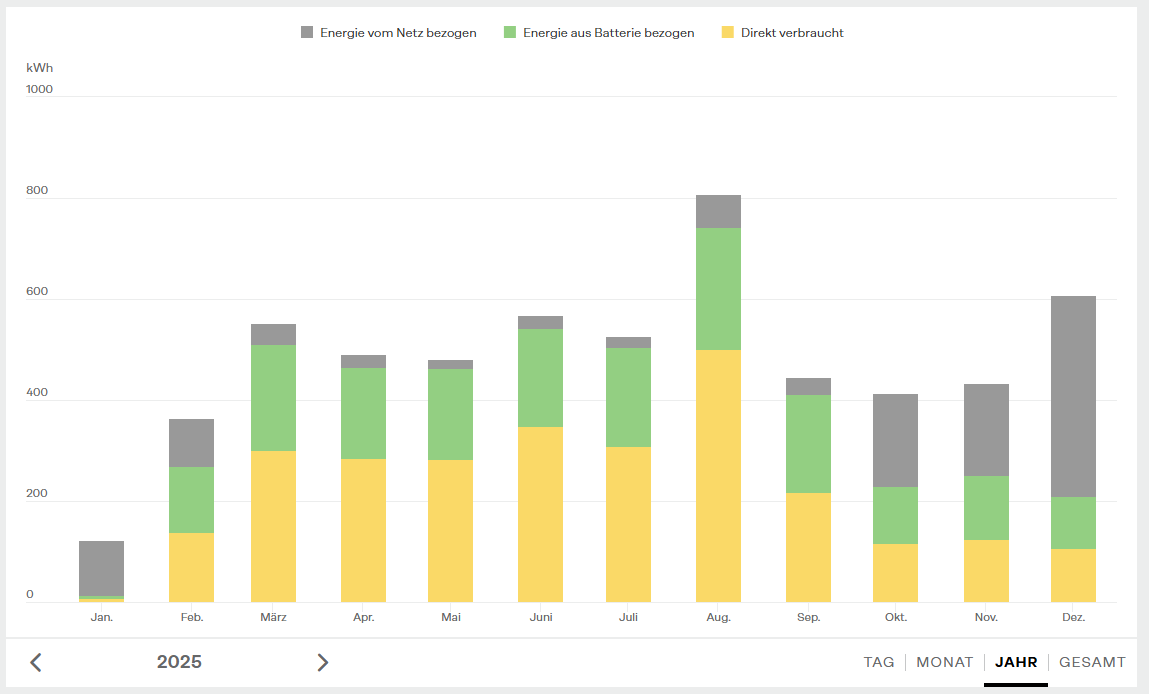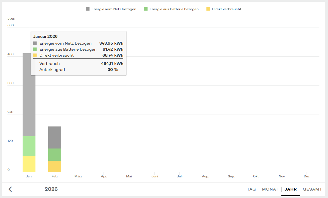 https://solar.htw-berlin.de/rechner/una ... tsrechner/ - hier gerne mal schauen zum Berechnen des Speichers. Man sieht klar, dass man den sehr groß machen kann, es aber kaum was bringt. Logisch, wenn die Anlage nicht mitwächst. Man bekommt den im Winter einfach nicht voll. Mein 11er Akku braucht im Dezember einen voll Sonnentag mit normalem Verbrauch bei einer 7er Anlage, um soeben die 100% zu erreichen. Wobei ich mit dem Ertrag aus Januar diesen Jahres recht zufrieden bin.