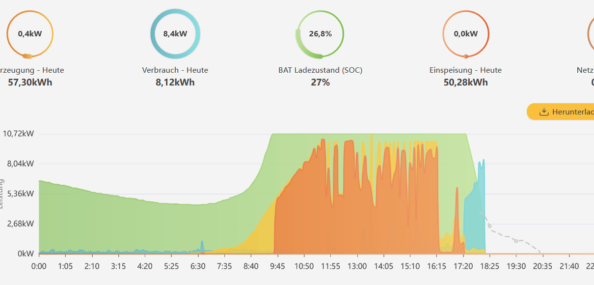 Hat gestern leider von 7:30 - bis fast 18:00 gedauert, in dem Moment wo die Wärmepumpe loslegen musse hat es leider ein Unwetter gegeben, und der voll geladene Akku musste den Strom zum aufheizen liefern: