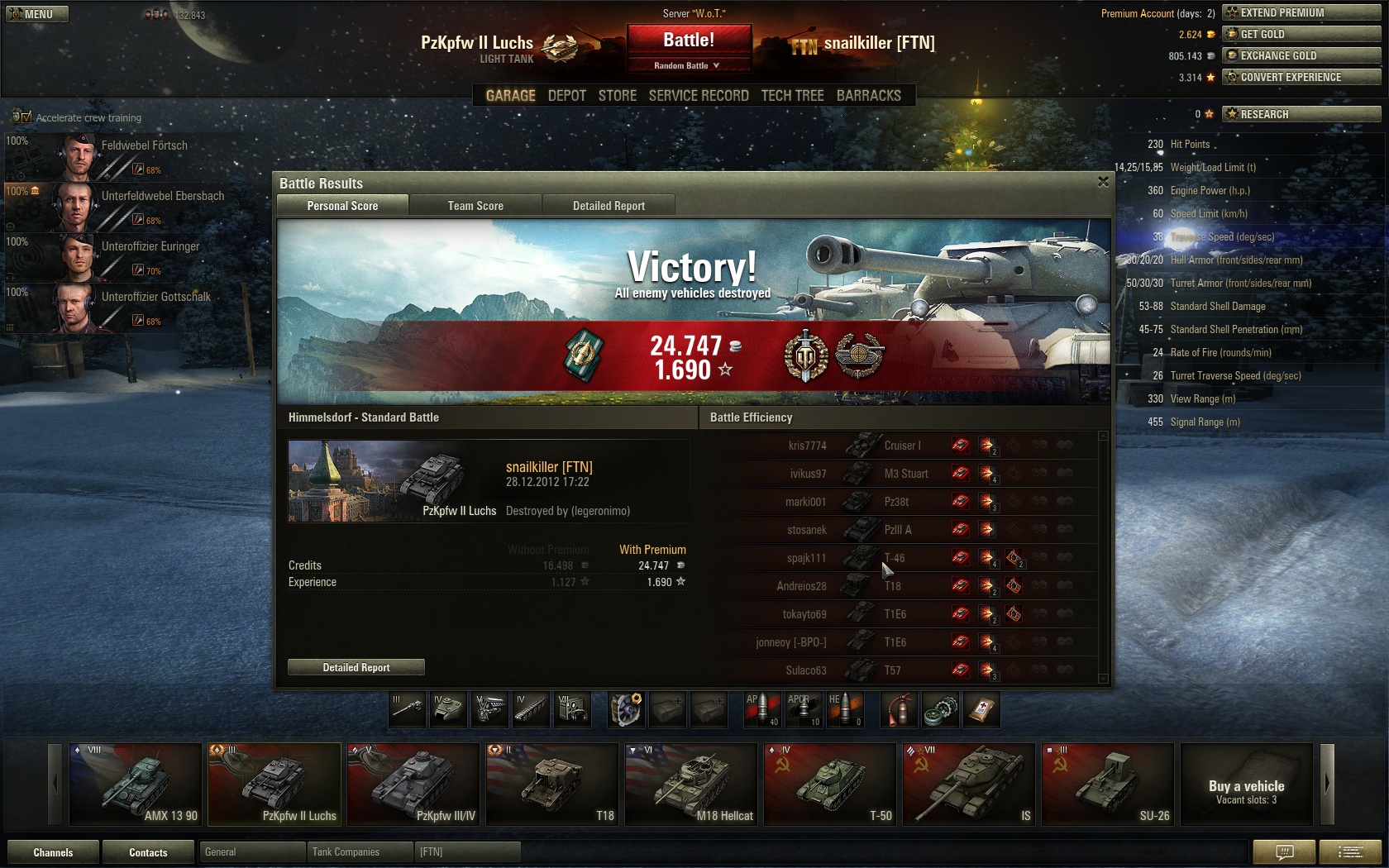 Vehicle: VK 2801 Experience received: 6.362 (x2 for the first victory each day)