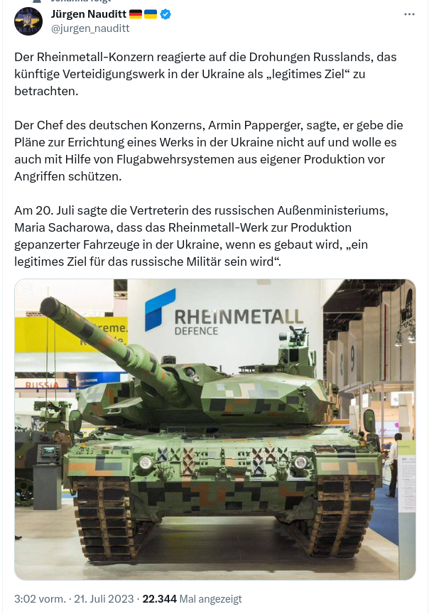 Das gibt sicher eine lustige Stellenausschreibung: "Für den Werk- und Objektschutz unserer Fertigung in der Ukraine suchen wir noch qualifizierte Mitarbeiter. Staplerschein, Führerschein, Fahrpraxis in militärischen Rad- und Kettenfahrzeugen, sowie Ausbildung an Gepard, IRIS-T oder SkyRanger werden vorausgesetzt."