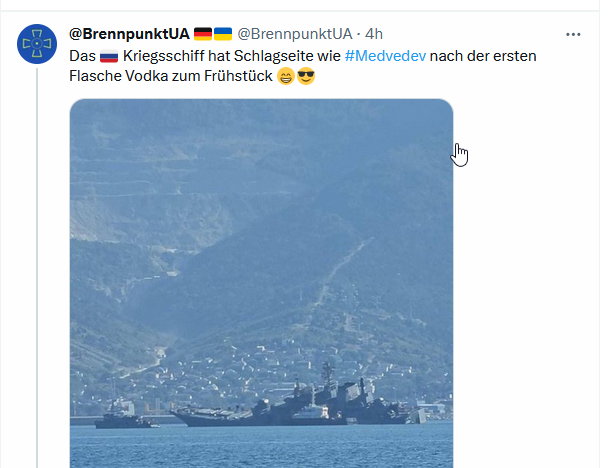 Schon bei der "Moskva" hat man ja gesehen, dass der Lack bei den russischen Großkampfeinheiten komplett ab ist. Das Ding war PRÄDESTINIERT für die Luftabwehr. Beste Luftabwehr-Einheit der Schwarzmeer-Flotte. Ein S-300F (und SA-6, sowie 6x AK-630 "CIWS") mit Schwimmärmchen und +30 knoten Geschwindigkeit. Wurde von zwei quasi im Keller aus rostigen Teilen improvisierten Neptune-Schiffsabwehr-Raketen der Ukraine versenkt.