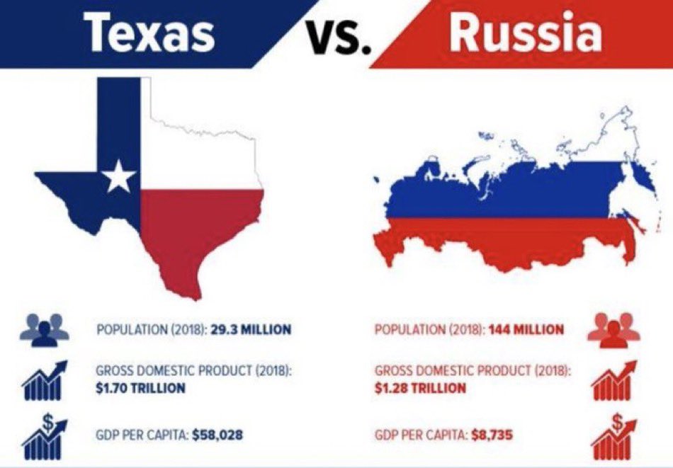 Texas hat 115 Mio Einwohner WENIGER als Russland, aber 25% größeres GDP als Russland und ein 6,6x mal größeres GDP per Capita.