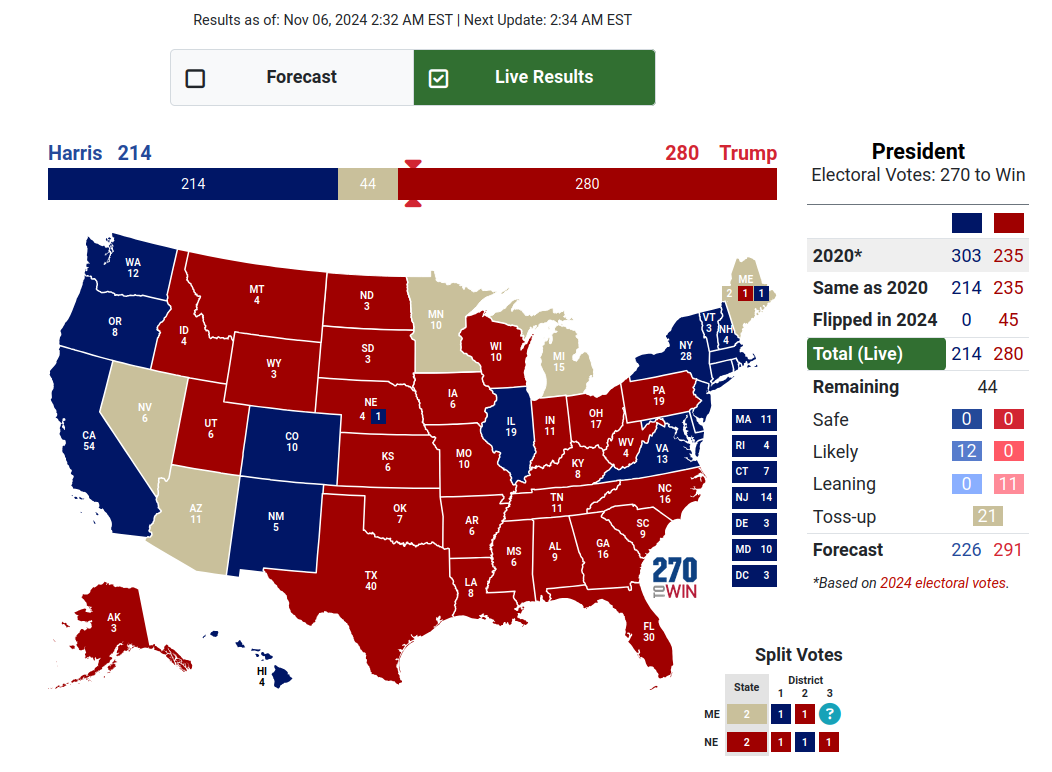 Leicht nachzurechnen: Trump hat mit 312 zu Harris 226 Stimmen gewonnen. Mit Michigan (15), Pennsylvania (19) und Wisconsin (10) wären es stattdessen mit 270-268 für Harris ausgegangen.