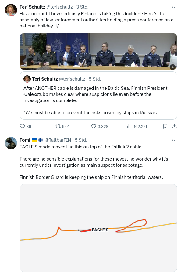 Zu den zerstörten Seekabeln für Strom: Die Finnen haben den Frachter "Eagle S" festgesetzt, den sie dafür verantwortlich machen. Das ist ein in Neuseeland registriertes Schiff, welches der "Schattenflotte" zugeordnet wird, welche für Russland Öl unter Umgehung der Sanktionen vertickt. Unmittelbar nach dem Schaden an den Kabeln hat eine finnische Spezialeinheit das Schiff geentert und übernommen. Es wurde dann in finnische Hoheitsgewässer gebracht. GENAU SO muss das laufen.